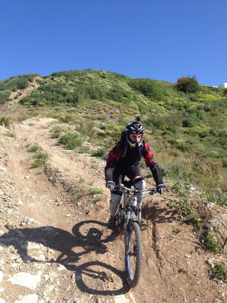 He dropped me off in Torremolinos, and I cycled the rest of the way. And OMG what a dump Torremolinos is. It is all bland 1970’s blocks of hotels with crumbling conncrete and small shabby shops, most of which were closed as it’s low season. Benalmedena, where switchbacks are located is much nicer. Michael, who runs the place, rents out a huge villa for a few months, stocks it with bike repair kit. Switchbacks customers stay there and get lifts up to the hills in a van (driven by Jesus and Lucky – both very auspicious names). The resident guide is an expert downhill racer called Alex who competes at world cup level. He’s very good at guiding and giving tips on technique. The other riders were also al better than me and my particular thanks go to Jon, Elizabeth and Rory who helped my oout in multiple ways.