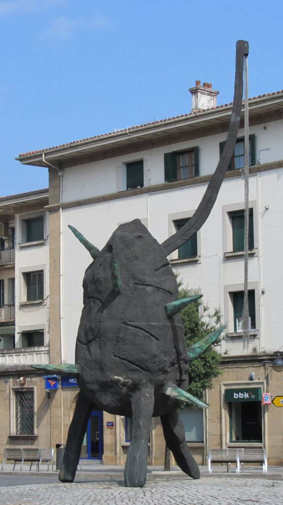 This was a long day – as I was leaving Itziar I was advised by 2 local chaps, independently, that the Camino norte was not doable on a mountain bike – especially with a trailer. I’d be carrying both up a long way. So I took the road which though easier was longer – in total 90km! And it was pretty hot. Apart from the exhaustion and sun stroke it was a pretty uneventful day – though as I passed through one town, Amorebieta, they had this statue in the town centre. God knows what it”s supposed to be.