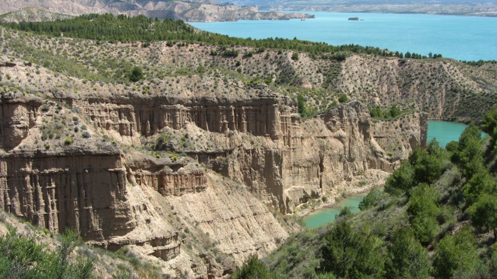 The route north from Gor to Pozo Alcon was over a pretty flat plateau, with gentle gradients down too a reservoir and then short steep climb out. The scenery was pretty spectacular though; the plateau was cut by deep ravines, and the substrate was not solid rock but very hard mud that was sculptured into fascinating shapes. See in the picture below how cliff has been eroded into what look like tapered Gothic pillars.